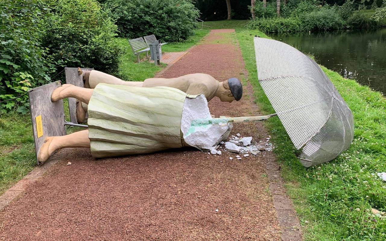 In Rheinberg wurde mal wieder ein kaputter Alltagsmensch gefunden. Gegen einen Jugendlichen wird ermittelt. Die lebensgroßen Tonfiguren werden häufig zum Opfer von Vandalismus.