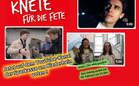 Drei Schulen im Kreis Wesel wollen mit selbstgedrehten Kurz-Filmen Geld für ihre Abschlussfeier gewinnen. Bei der Sparkassen-Aktion "Knete für die Fete" werden 500, 750 und 1000 Euro vergeben. Dabei entscheidet neben der Jurybewertung auch die Zahl der Likes über den Sieg. Bis zum 20 Februar werden die Video-Likes auf dem YouTube-Kanal der Sparkasse gesammelt. Aus dem Kreis Wesel beteiligen sich das Moerser Adolfinum, das Gymnasium Rheinkamp und das Amplonius-Gymnasium in Rheinberg mit eigenen Filmen. Die Siegerehrung im Stil einer Oscar-Verleihung findet am 6. März statt.