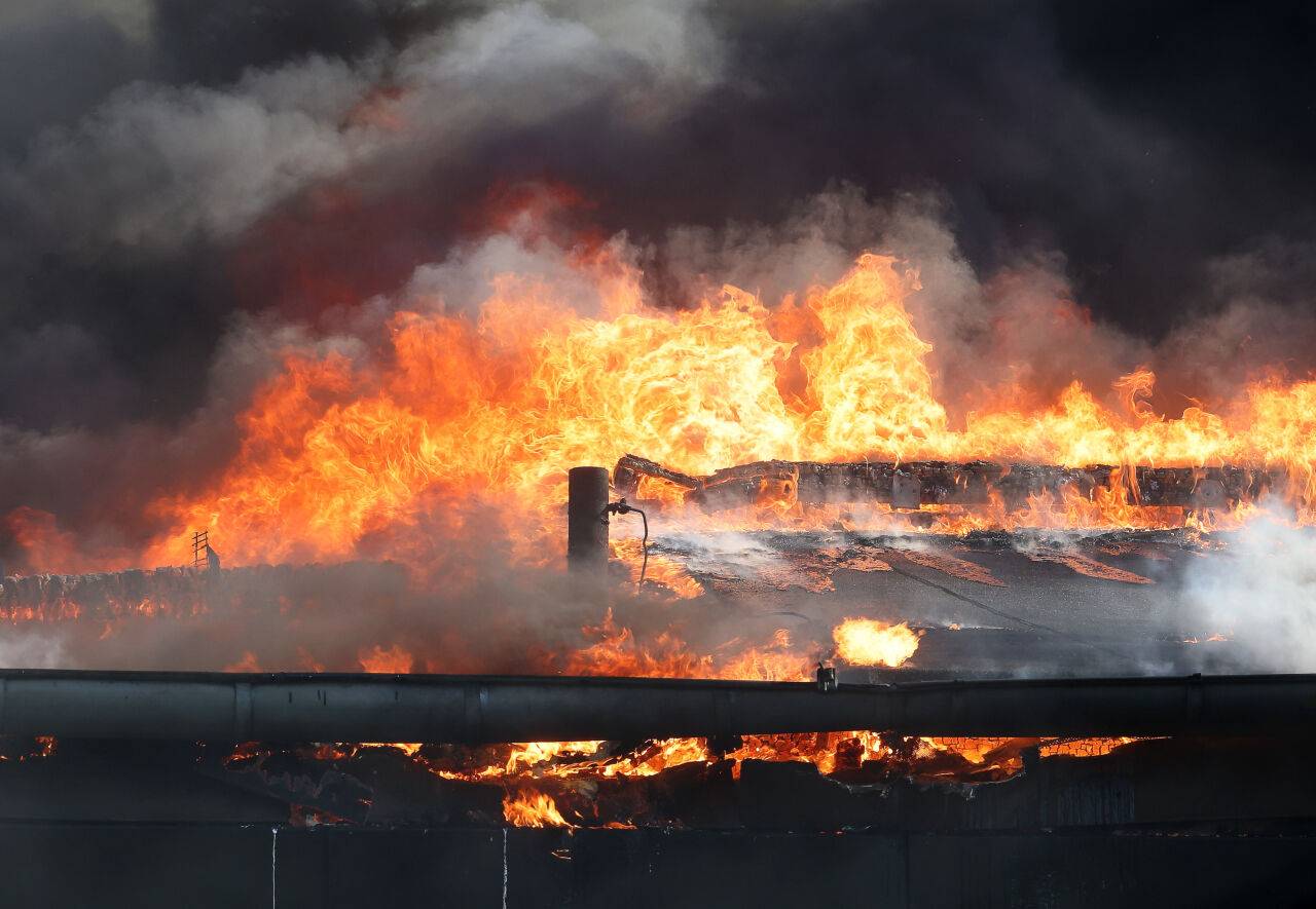 Flammen schlagen bei dem Großbrand aus dem Dach des Gebäudekomplexes mit mehreren Schulen im Kreis Mettmann.© picture alliance/dpa | David Young