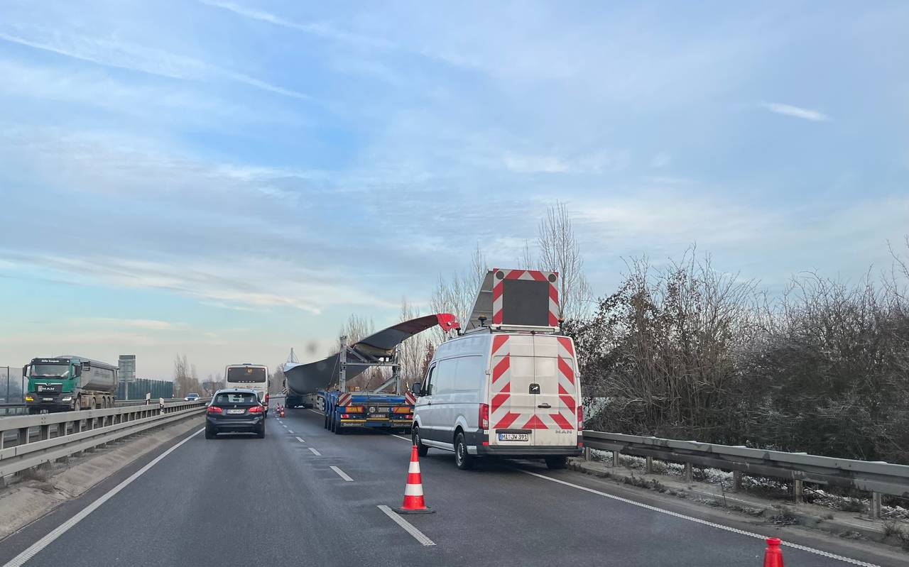 Ein Schwertransport mit Rotorblättern für ein Windrad blockiert eine Spur der B58. Seit gestern Nacht steht er auf der rechten Spur hinter der Kreuzung Ginderich, der Xantener Straße auf der B58 in Richtung Wesel. Eigentlich sollten die Blätter in der Nacht zu einer neuen Anlage nach Wesel-Büderich geliefert werden. Allerdings kommt der Schwertransport nicht um die Kurve. Laut Angaben der Polizei wird er da bis mindestens morgen früh stehen. Bevor er weiterfahren kann, müssen möglicherweise die Ampelanlagen abgebaut werden. Die Polizei bittet vor allem Abbieger aus Ginderich besonders vorsichtig zu fahren, weil der Transport die rechte Fahrbahn hinter der Kreuzung blockiert.