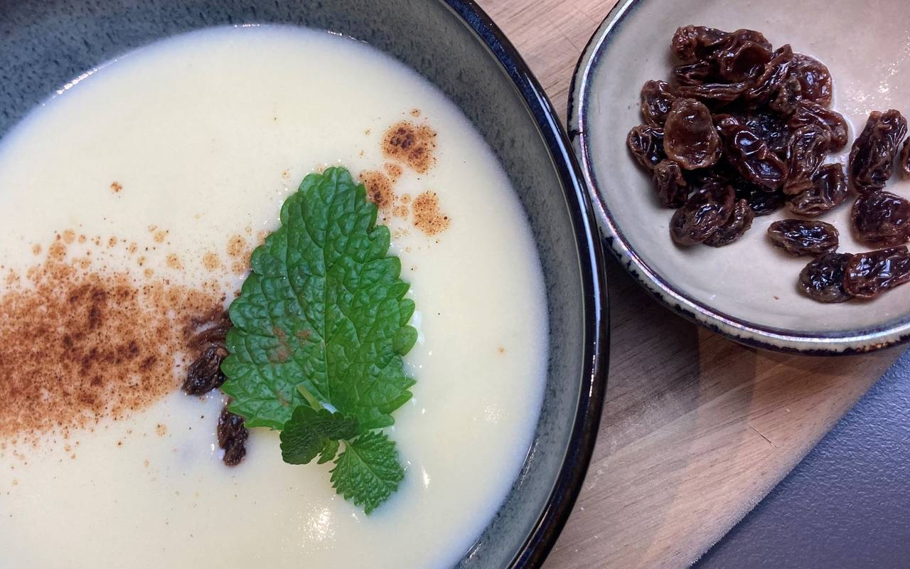 Rosinen einweichen, Puddingpulver mit ein bisschen Buttermilch und dem Zucker verrühren. Mischung in die Buttermilch einrühren, Mischung unter Rühren kurz aufkochen. Im Anschluss die Suppe auf Teller verteilen, eingeweichte Rosinen als Suppeneinlage dazugeben - und mit Zimt und Minze verzieren.