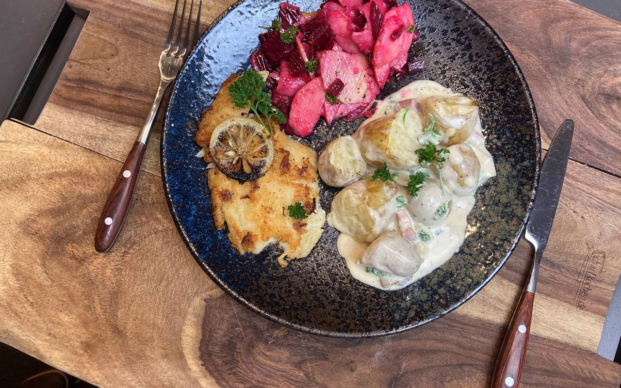 Zuerst die Rote Bete und den Apfel in Würfel bzw. feine Spalten schneiden und in eine Schüssel geben. Marinade aus Salz. Pfeffer, Zucker. Öl, Essig, Zucker und Senf anrühren und über den Salat geben. Alles vermengen und zur Seite stellen. Kartoffeln schälen, etwas kleiner schneiden und kochen. Fisch in 150 g-Stücke schneiden. Säubern, salzen und mehlieren. Den Fisch in Butterschmalz etwa 10 Minuten sanft braten, Zitrone in Scheiben geschnitten dazu geben. Währenddessen die Sauce kochen. Dazu Speck und Zwiebeln würfeln und in Butterschmalz anbraten. Das Ganze mit Mehl bestäuben, Milch und Sahne dazugeben und aufkochen lassen. Wenn die Sauce andickt, mit Salz, Pfeffer und Muskat würzen. Die gekochten Kartoffeln in die Sauce geben, die gehackte Petersilie einsträuen. Fertigen Fisch. Kartoffeln in der Sauce und Rote Bete-Apfel-Salat anrichten. Eventuell ein bisschen frischen Pfeffer auf den Fisch geben.