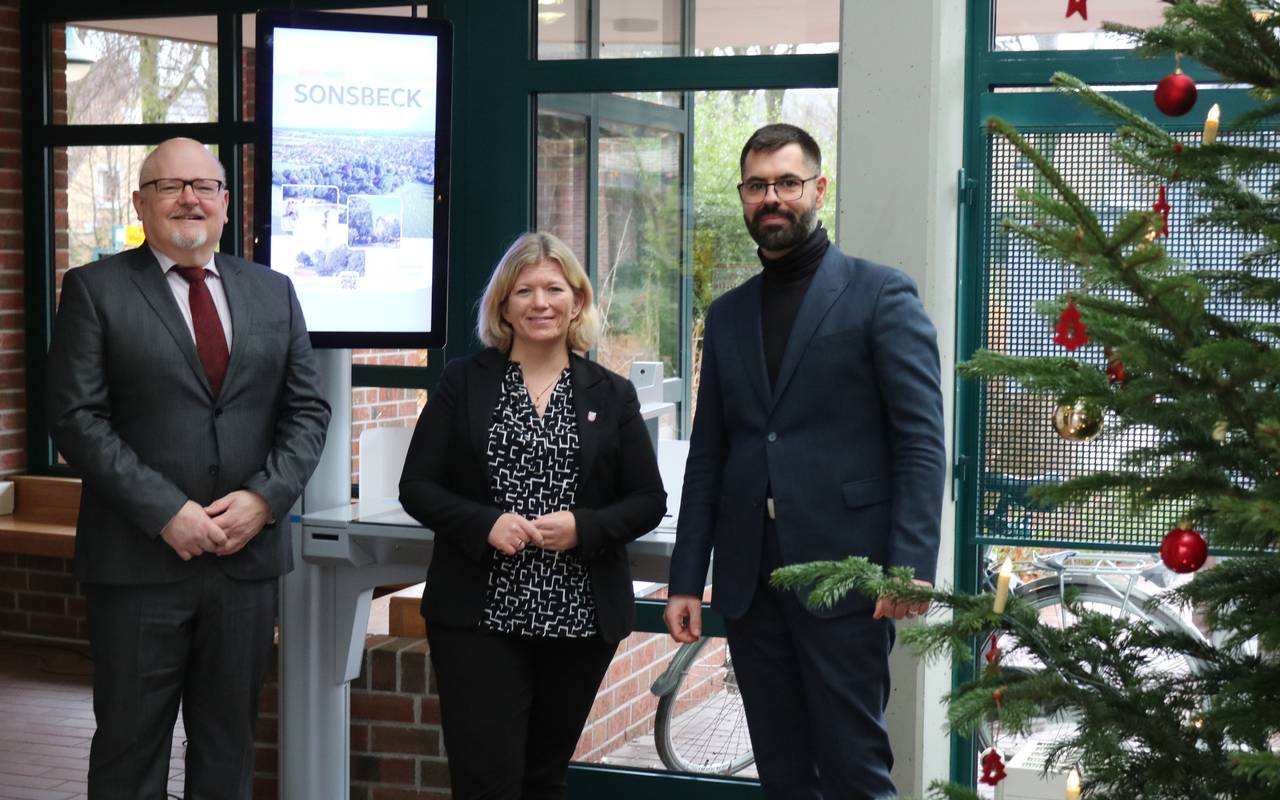 Im Foyer des Sonsbecker Rathauses steht jetzt ein großer Touchscreen. Die Gemeinde hat hier einen digitalen Servicepunkt eröffnet. Das Angebot soll dabei noch erweitert werden.