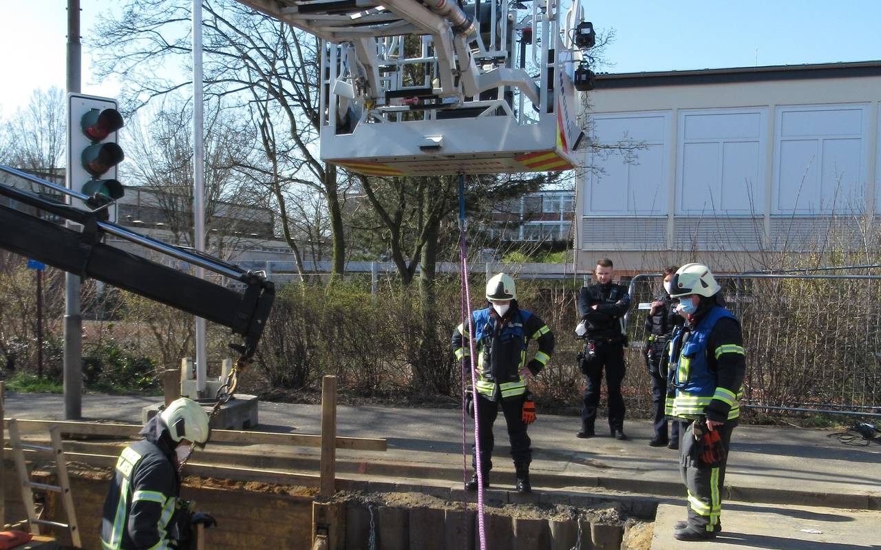 Die Feuerwehr Dinslaken wurde heute Mittag zu einem spektakulären Einsatz gerufen. Auf der Tiefbaustelle auf der Hans-Böckler - Straße war es zu einem Unfall gekommen. Ein Arbeiter war mit einem Bein zwischen zwei Fernwärmeleitungen eingeklemmt. Der Patient wurde durch den Rettungsdienst und Notarzt erstversorgt. Danach wurde der Mann durch die Feuerwehr mit einer Drehleiter und einem Schleifkorb aus der fünf Meter tiefen Baugrube gerettet. Der Mann wurde ins Krankenhaus gebracht.