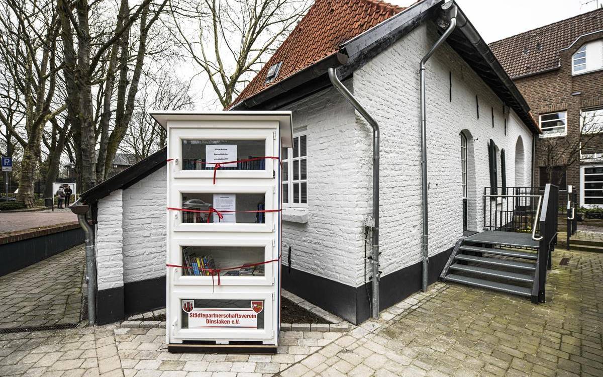Seit Ende März können sich Dinslakener Bücher aus dem Bücherschrank am Rittertor ausleihen. Jetzt vermisst die Stadt einige Bücher und bittet darum, sie zurückzubringen.