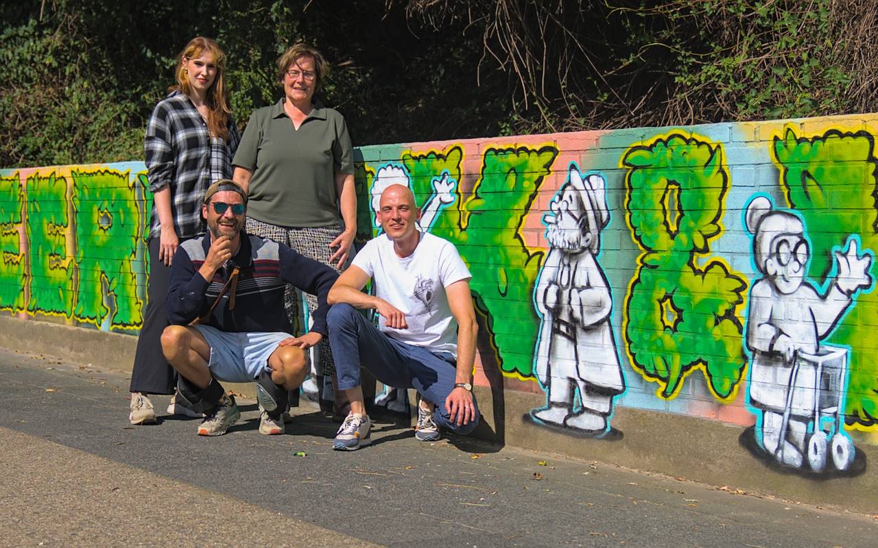Ein 50 Meter langes, farbenfrohes Wandbild an der Römerstraße zeigt die Vielfalt und den Zusammenhalt in Meerbeck und Hochstraß.