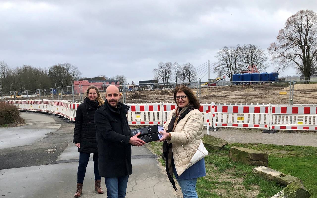 Ein halbes Jahr hat es vom Antrag bis zur Genehmigung gedauert, aber heute konnte Wesels Bürgermeisterin Ulrike Westkamp die Baugenehmigung für das neue Rheinbad übergeben. Empfänger war Martin Christoph, Geschäftsführer der Städtischen Bäder Wesel GmbH und Bauherr des Projekts. Bei der Übergabe erläuterte Christoph auch den aktuellen Stand der Arbeiten. Die Sondierungs- und Abrissarbeiten sind abgeschlossen und es kann mit dem Neubau begonnen werden. In diesem Jahr soll das Kellergeschoss gebaut werden. Dafür rollen ab nächster Woche die Bagger auf der Baustelle am Rheinufer.