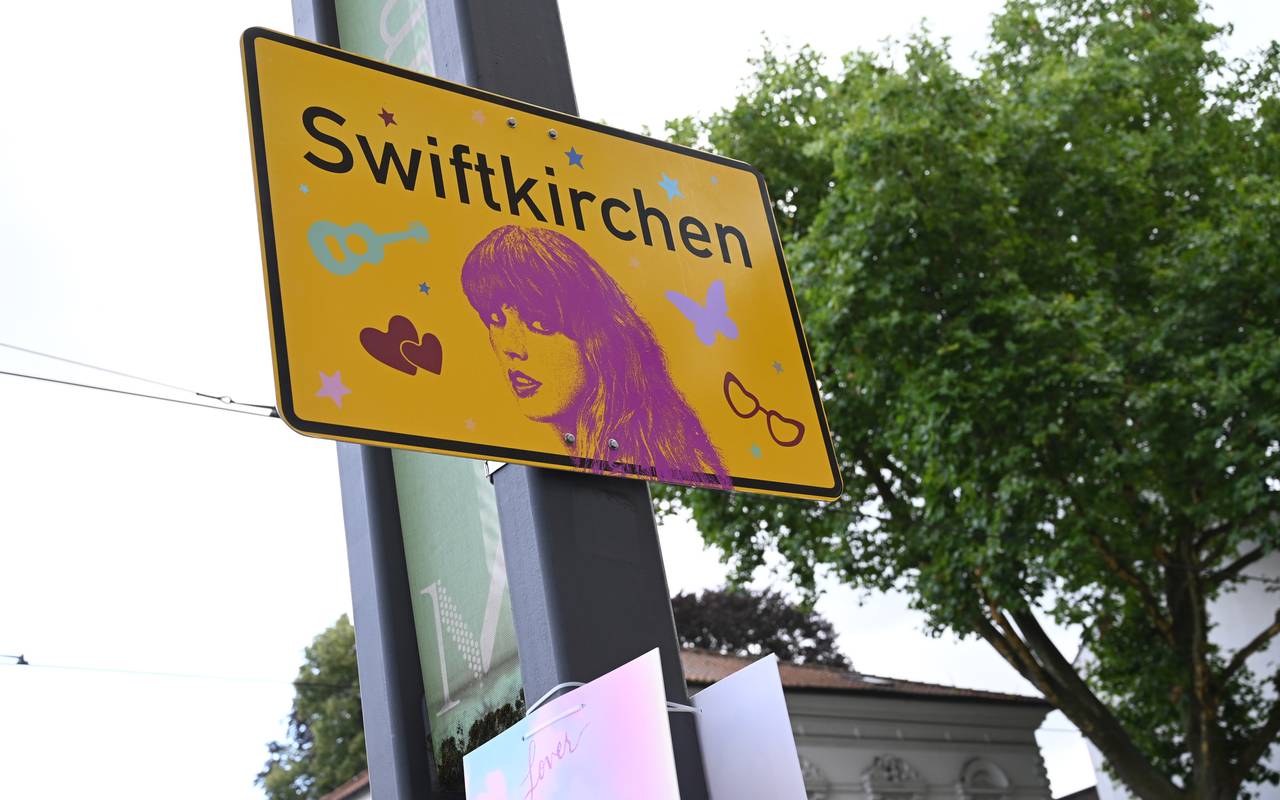 Erst eine Woche her und schon museumsreif: Eines der "Swiftkirchen"-Ortsschilder, die die Stadt Gelsenkirchen anlässlich der Taylor-Swift-Konzerte in der Stadt aufgehängt hat, kommt ins Bonner Haus der Geschichte der Bundesrepublik Deutschland. Das Museum sammelt Objekte zur Zeitgeschichte. Das Phänomen der Pop-Ikone aus den USA wird nun anhand der Aktionen in Gelsenkirchen präsentiert. Das Schild wird heute übergeben.