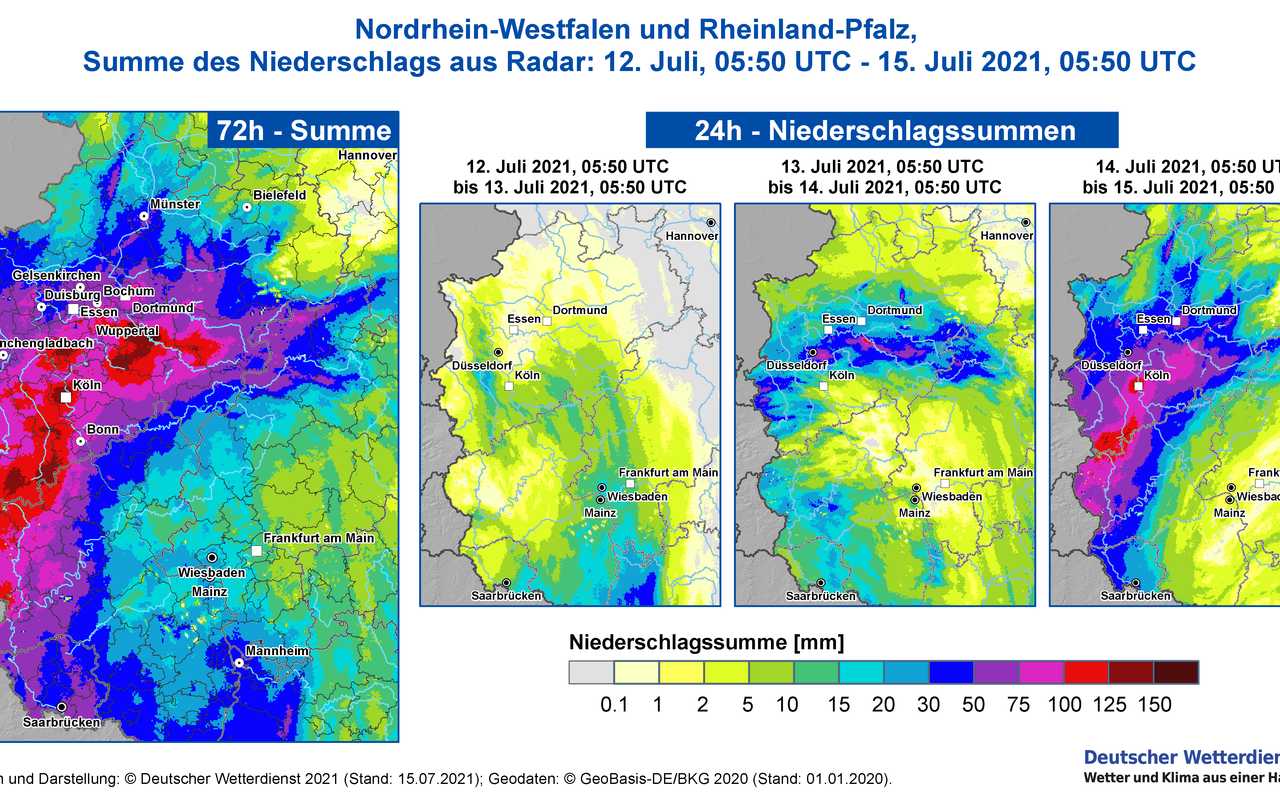 Tief Bernd hat diese Woche extrem viel Regen nach NRW und Rheinland-Pfalz gebracht. Noch immer sind überall Retter im Einsatz, viele Menschen sind gestorben und die Aufräumarbeiten werden noch viele Tage dauern. Der Deutsche Wetterdienst (DWD) hat eine erste Auswertung der Niederschläge auf Karten dargestellt. Hier kam man sehen, wo am meisten Regen in unserer Region runtergekommen ist.