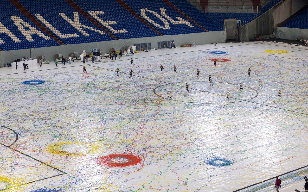 Auf Schalke ist am Wochenende ein Weltrekord geglückt und er hat nur bedingt mit Fußball zu tun. Bei einer Veranstaltung für freiwillige Helfer für die Fußball-EM ist das größte Gemälde der Welt entstanden. Die Fläche in der Veltins Arena, wo sonst der Rasen liegt, wurde mit Folie und Karton ausgelegt. Kicker drehten auf der Fläche ihre Runden und spielten, mit Farbe beladen, legendäre Spielzüge nach.