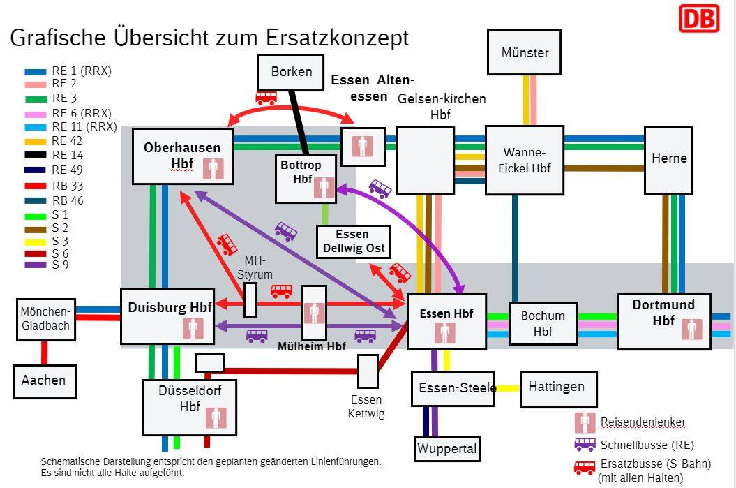 Fernzüge halten nicht in Bochum, Essen und den weiteren Bahnhöfen bis Duisburg. Auch viele S-Bahnen und Regionalzüge werden umgeleitet, die Bahn setzt auch Ersatzbusse ein. Die Bauarbeiten dauern vom 11. bis zum 20. September. In dieser Zeit bündelt die Bahn viele nötige Bauarbeiten für neue Schienen, Brücken und an Stellwerken.